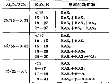 Al2O3/Si02=0.33相當于含Al20325%的酸性粘土磚,當K20含量<15%時,只形成正長石;直到K2O含量為27%,未有鉀霞石生成。因為大量的正長石的生成和穩(wěn)定存在,于磚面形成封閉層,阻止了堿化合物的內(nèi)滲,使磚體免受喊進一步侵蝕。故可以認為K2O<27%時,磚體不會發(fā)生“堿裂”。但正長石的分解溫度為1150℃,因此使用限制在1150℃以下。