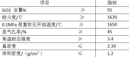 輕質(zhì)硅磚的礦物組成為:磷石英78%〜86%,方石英78%〜86%,石英78%〜86%。一般輕質(zhì)硅磚的耐壓強度2.0〜9.5MPa,熱導(dǎo)率0.35〜0.42W/(m·K)。輕質(zhì)硅磚具有優(yōu)良的耐火性能,荷重軟化溫度接近致密硅磚達到1620℃以上,僅有少量的殘余膨脹,并且其熱穩(wěn)定性能比致密硅磚好。因此,輕質(zhì)硅磚可在不與熔渣接觸的高溫條件下1500〜1550℃長期使用。下圖列出了我國工業(yè)窯爐用輕質(zhì)硅磚的技術(shù)條件。